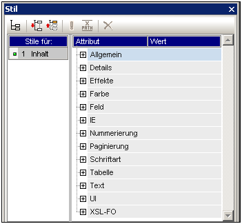 Oft enthält die in der Design-Ansicht ausgewählte Komponente andere Komponenten. In diesem Fall werden alle Komponenten in der Auswahl geordnet nach Komponententyp in der Seitenleiste "Stil" in der Spalte Stile für angezeigt. In der Abbildung unten sehen Sie die verschiedenen Komponententypen, die die Auswahl in der Design-Ansicht enthält. Links von jeder Komponente wird die Anzahl der Instanzen dieser Komponente innerhalb der Auswahl angezeigt. So gibt es z.B. in der Abbildung unten in der Design-Ansicht unter anderem 16-Textkomponenten und zwei XPath-Komponenten. Sie können auch einen Komponentenbereich auswählen, indem Sie die Umschalttaste gedrückt halten, während Sie die zweite Komponente am Ende des Bereichs auswählen.