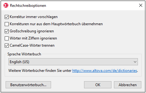 Wählen Sie  im Dropdown-Listenfeld eine Sprache, in der die Rechtschreibprüfung erfolgen soll. Die Standardeinstellung ist US-Englisch. Wörterbücher in weiteren Sprachen können kostenlos von der Altova Website heruntergeladen werden.