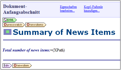 Automatische Berechnungen sind eine effiziente Methode, um anhand der verfügbaren XML-Daten zusätzliche Informationen bereitzustellen. In diesem Abschnitt werden zwei Informationen zum Design hinzugefügt: die Gesamtzahl der Nachrichten (news items) und der Zeitraum, den diese Nachrichtenmeldungen im XML-Dokument abdecken. Keine dieser Informationen ist im XML-Dokument direkt verfügbar, sondern beide Informationen müssen anhand der verfügbaren Daten errechnet werden.