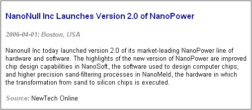 Eine weitere Verwendung vordefinierter Formate ist die Gruppierung von Design-Komponenten in Blöcken, sodass sie als Block formatiert werden können oder dass ihnen als Gruppe Eigenschaften innerhalb einer Zeile zugewiesen werden können. Die praktischste vordefinierte Eigenschaft für diesen Zweck ist das vordefinierte Format div, welches einen Block ohne Zeilenabstände oberhalb oder unterhalb davon erstellt. Weisen Sie in Ihrem Design den Nodes newsitem, dateline, synopsis und source separate div-Komponenten zu. Ihr Design sollte ungefähr wie in der unten gezeigten Abbildung aussehen. Beachten Sie, dass in der div-Komponente, die das Element source enthält, auch der statische Text "Source: " enthalten ist, und dass sich das gesamte newsitem-Element innerhalb einer div-Komponente befindet.