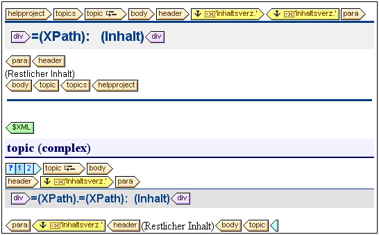 Im Content Model, das in der Abbildung oben dargestellt wird, ist topic ein rekursives Element, d.h. ein topic-Element kann selbst ein untergeordnetes topic-Element enthalten. In der Hauptvorlage (das Ende der Hauptvorlage wird durch den Tag tag_closemaintemplates gekennzeichnet) wurde eine Ebene auf der ersten Ebene von topic tag_TOCLevelOnTemplate angelegt. Die Anweisung restlicher Inhalt in der Hauptvorlage legt fest, dass für alle Child-Elemente von topic/body mit Ausnahme von headerVorlagen angewendet werden. Das bedeutet, dass die globale Vorlage für topic Child-Elemente von topic/body verarbeitet wird.