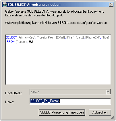 2.Geben Sie die SELECT-Anweisung ein. Wenn Sie eine Verbindung zu einer Oracle oder IBM DB2-Datenbank über JDBC herstellen möchten, darf die SELECT-Anweisung kein Semikolon am Schluss enthalten. Wenn Sie eine SELECT-Anweisung für eine ganze Tabelle erstellen wollen, klicken Sie mit der rechten Maustaste im Dialogfeld "Datenbankobjekte einfügen" auf die Tabelle und wählen Sie den Kontextmenübefehl SELECT-Anweisung erzeugen und hinzufügen.