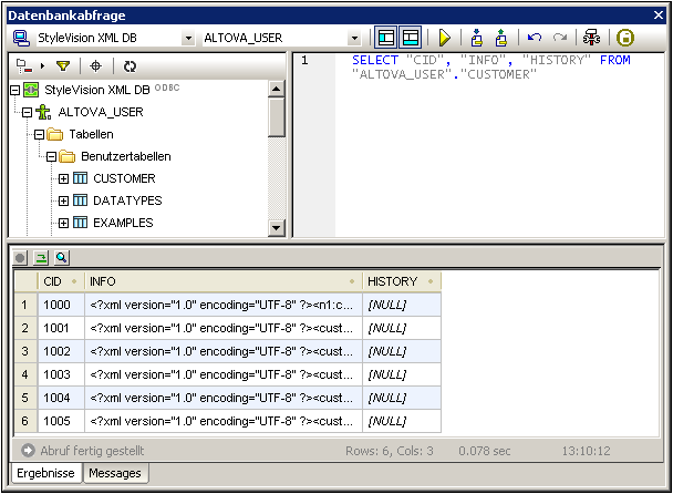 einem mit Registern versehenen Ergebnis-/Meldungsfenster. Im Fenster "Ergebnisse" werden die Ergebnisabfrage im sogenannten Ergebnisraster angezeigt. Im Fenster "Meldungen" werden die Meldungen (einschl. Fehler- und Warnmeldungen), die bei der Ausführung der DB-Abfrage generiert werden, angezeigt.