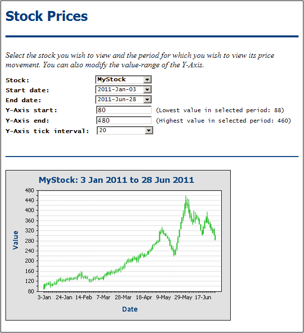 Das Selection-Element enthält Informationen, die vom Benutzer der Authentic-Ansicht eingegeben werden. Anhand dieser Informationen wählt der Benutzer aus, welche Daten im Diagramm dargestellt werden sollen. Eine nähere Erläuterung dazu finden Sie im nächsten Abschnitt. Die Daten über die Kursbewegungen der einzelnen Aktien an einem bestimmten Tag befinden sich im Stock/Day-Element der entsprechenden Aktie am jeweiligen Tag.