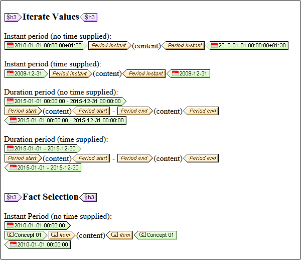 Sie können die Vorlage im geschlossenen Modus verwenden, um Aspects der Periode wie z.B. (durch Verwendung der Aspect-Wert-Vorlagen der Periode) den Periodenbeginn anzuzeigen oder um Instanzdokument-Facts, die die definierte Periode enthalten, auszuwählen. In der Abbildung unten sehen Sie beide Verwendungsarten.