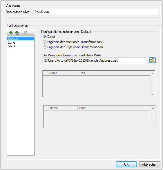 3.Wählen Sie für jede Konfiguration einen Ressourcentyp aus: Wählen Sie eine Konfiguration in der Konfigurationsliste aus und definieren Sie im Bereich Konfigurationseinstellungen eine Ressource für die Konfiguration: (i) Datei, (ii) Ergebnis der MapForce Transformation oder (iii) Ergebnis der StyleVision Transformation. Aktivieren Sie das entsprechende Optionsfeld. Bei Auswahl einer MapForce bzw. StyleVision Transformation wird anhand der entsprechenden .mfd oder .sps-Datei und der entsprechenden Input-Datei eine Transformation in MapForce oder StyleVision durchgeführt. Die Ressource wird mit der Transformation erzeugt.