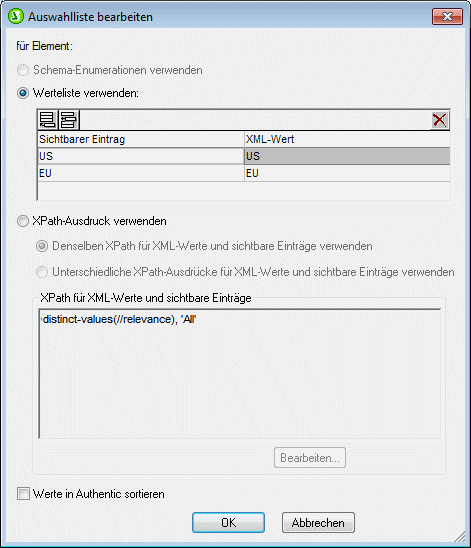 Bei Auswahl der Option "Werteliste verwenden" können Sie beliebig viele Einträge für die Dropdown-Liste der Auswahlliste sowie für die zugehörigen XML-Werte einfügen, anhängen, bearbeiten und löschen. Diese Bearbeitungen werden im Feld unterhalb der Optionsschaltfläche Werteliste verwenden durchgeführt. Sie können die sichtbaren Einträge und deren XML-Werte auch mit Hilfe eines XPath-Ausdrucks ermitteln. Die Einträge in der Sequenz, die vom XPath-Ausdruck zurückgegeben werden, werden als sichtbare Einträge und XML-Werte verwendet. Sie können festlegen, (i) dass derselbe XPath-Ausdruck für die sichtbaren Einträge und die XML-Werte verwendet werden soll oder (ii) dass unterschiedliche XPath-Ausdrücke verwendet werden sollen. In zweiterem Fall wird die Entsprechung zwischen dem sichtbaren Eintrag und dem XML-Wert durch ein 1:1-Index-Mapping festgelegt. Wenn die Anzahl der Einträge in den beiden Sequenzen nicht gleich ist, wird ein Fehler ausgegeben.