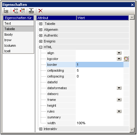 Tabelle | border, frame, rules; cellpadding, cellspacing; bgcolor; height, width (wird durch height, width in der Seitenleiste "Stile" überschrieben, falls vorhanden); align | Umrandungen (border) und Abstände (padding) in Feldstilen; height, width in der Gruppe "Details" (überschreibt height und width in der Seitenleiste "Eigenschaften"); Farbe, Schriftart und Textstile |