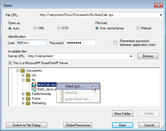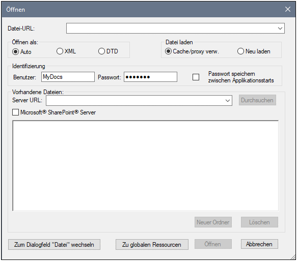 Es gibt mehrere Dialogfelder zum Öffnen und Speichern von Dateien, über die Sie die gewünschte Datei entweder über eine URL oder eine globale Ressource (siehe Abbildung unten) auswählen bzw. speichern können. Wählen Sie den Befehl Zu URL wechseln oder Globale Ressourcen, um das entsprechende Dialogfeld aufzurufen.