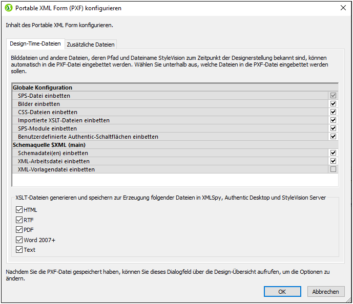 Das SPS-Format ist das Altova-Standardformat für StyleVision Designs. Das PXF-Format ist ein Altova-Format, mit dem alle mit dem Design in Zusammenhang stehenden Dateien (Schema-Dateien, XML-Dateien, Bilddateien, generierte XSLT-Stylehsheets, usw.) zusammen mit dem Design eingebettet werden können. Dieses Format eignet sich gut zum Transferieren aller Dateien, die zum Öffnen des Designs in der Authentic-Ansicht und/oder zum Generieren der HTML-, Text- und/oder RTF-Ausgabe anhand des Designs benötigt werden.