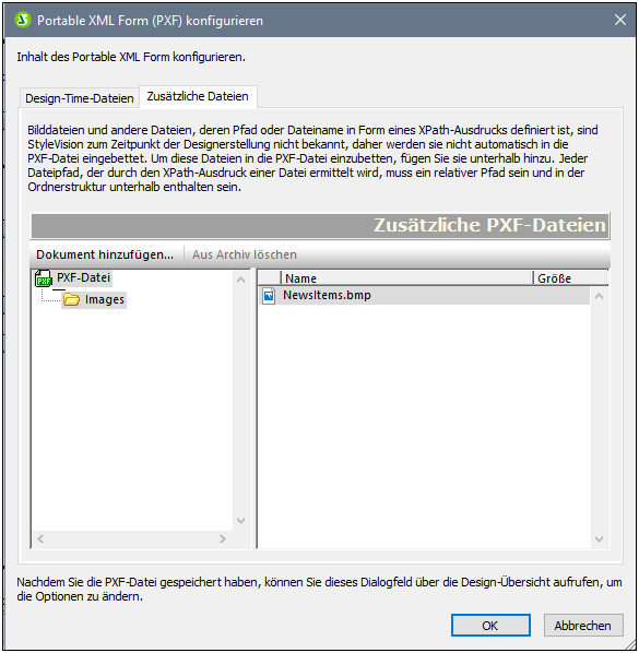 Auf dem Register Zusätzliche Dateien (Abbildung unten) können Sie alle zusätzlichen Dateien angeben, bei denen es sich nicht um Design Time-Dateien handelt und die ebenfalls in die PXF-Datei inkludiert werden sollen. Dabei könnte es sich z.B. um Bilddateien handeln, die im Design durch eine mit einem XPath-Ausdruck generierte URL referenziert werden. In der Abbildung unten wurde die Bilddatei NewsItems.bmp aus dem Ordner Images ausgewählt, um in die PXF-Datei inkludiert zu werden.
