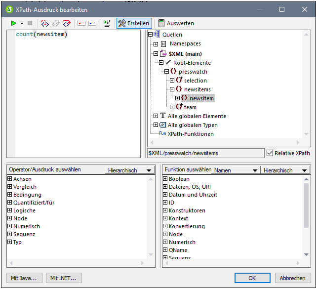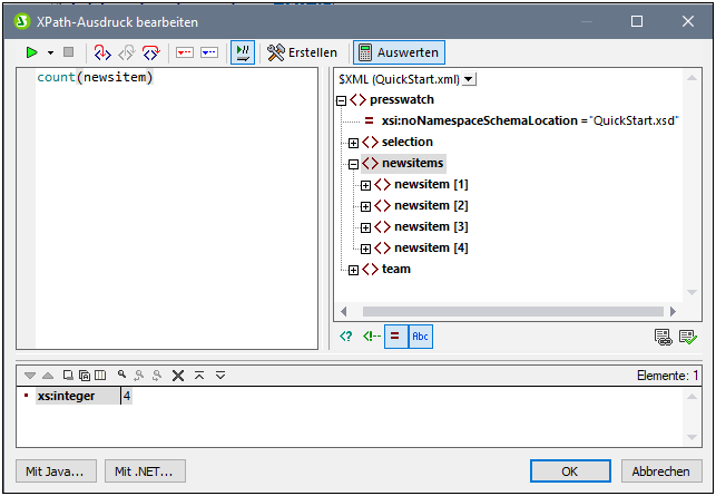 5.Beachten Sie, dass der Kontext-Node in der Schemastruktur der Node newsitems ist. Dieser Node erscheint markiert. Geben Sie nun im Textfeld "Ausdruck" entweder den Ausdruck count(newsitem) ein oder erstellen Sie den Ausdruck mit Hilfe der Eingabehilfefenster unterhalb des Textfelds für den Ausdruck. (Doppelklicken Sie in der Funktionsgruppe Sequenz auf die Funktion count, um Sie zu übernehmen, setzen Sie anschließend im Textfeld "Ausdruck" den Cursor zwischen die Klammern der Funktion und doppelklicken Sie in der Schemastruktur auf den newsitem Node. Um zu sehen, welches Ergebnis vom XPath-Ausdruck zurückgegeben wird, klicken Sie auf die Schaltfläche Auswerten. Das Ergebnis der Auswertung wird im Bereich Ergebnisse angezeigt (siehe Abbildung unten). Eine ausführliche Beschreibung des Dialogfelds "XPath-Ausdruck bearbeiten" finden Sie im Abschnitt XPath-Ausdruck bearbeiten.