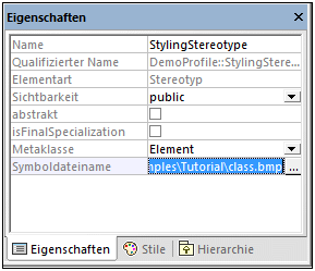 neben der Eigenschaft Symboldateiname. Wählen Sie das folgende Beispielbild aus: C:\Benutzer\<Benutzername>\Dokumente\Altova\UModel2026\UModelExamples\Tutorial\class.bmp.