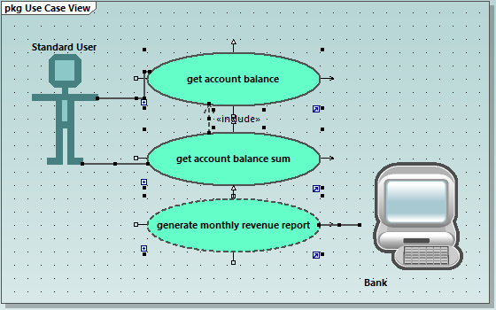 6.Klicken Sie in der Symbolleiste auf das Symbol Assoziation um_ic_association und ziehen Sie es vom Akteur "Bank" zum Use Case "generate monthly revenue report".