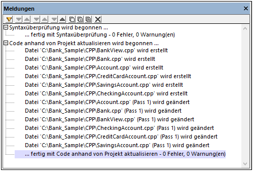 Im Fenster "Meldungen" wird das Ergebnis der C++-Codegenerierung angezeigt:
