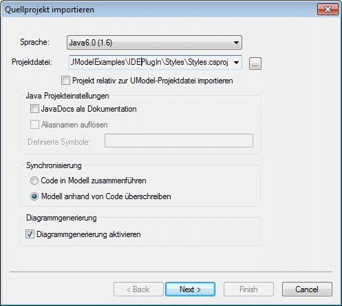 1) Im Dialogfeld "Quellprojekt importieren", "Binärtypen importieren" bzw. "Quellverzeichnis importieren" muss das Kontrollkästchen Diagrammgenerierung aktivieren aktiviert sein.