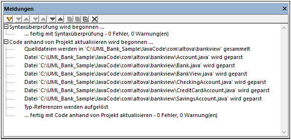 Im Fenster "Meldungen" werden die folgenden Arten von Meldungen angezeigt: Informationsmeldungen, Warnungen und Fehler. Solche Meldungen können vorkommen, wenn Sie die Projektsyntax überprüfen (siehe Überprüfen der Projektsyntax) oder wenn Sie Code Engineering-Aufgaben durchführen. Nähere Informationen zum Code Engineering finden Sie unter Generieren von Programmcode und Importieren von Quellcode.