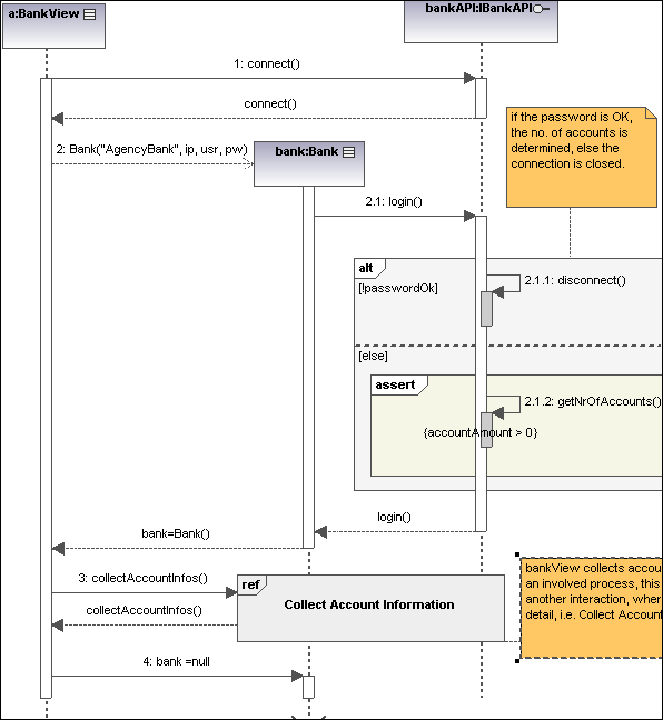 UModel unterstützt das in UML definierte Standard-Sequenzdiagramm und ermöglicht die einfache Manipulation von Objekten und Nachrichten zur Modellierung von Fallszenarien. Das im folgenden Abschnitt gezeigte Aktivitätsdiagramm steht im UModel-Ordner ...\UModelExamples in den Beispielen Bank_Java.ump, Bank_CSharp.ump and Bank_MultiLanguage.ump zur Verfügung.