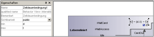 Die Standard-Minimum- und Maximum-Werte "d..t" werden automatisch vorgegeben. Durch Doppelklick auf die Zeitdauerbedingung oder durch Bearbeitung der Werte im Fenster "Eigenschaften" können Sie diese Werte bearbeiten.