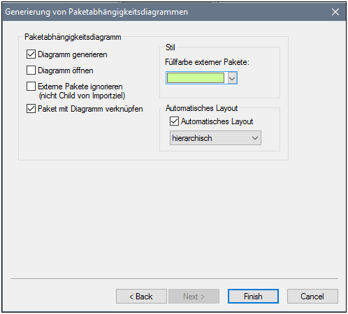 | 5. | Wählen Sie die Option Diagramm pro Paket generieren, damit UModel für jedes Paket ein neues Diagramm generiert. Sie können die Diagrammstile später gegebenenfalls ändern. |
