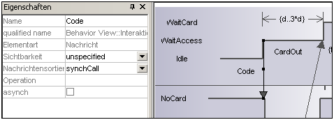 3.Ziehen Sie die Nachrichtenlinie auf die Zeitlinie der empfangenden Objekte, z.B. NoCard. Die Lebenslinie erscheint markiert, wenn die Nachricht an diese bestimmte Stelle gezogen werden kann.