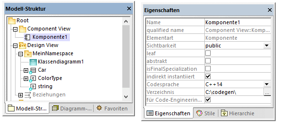 •Klicken Sie im Fenster "Modell-Struktur" auf die Klasse, die von der Komponente realisiert werden soll (in diesem Beispiel Car und ColorType) und ziehen Sie sie mit der Maus auf die Code Engineering-Komponente (Komponente1).