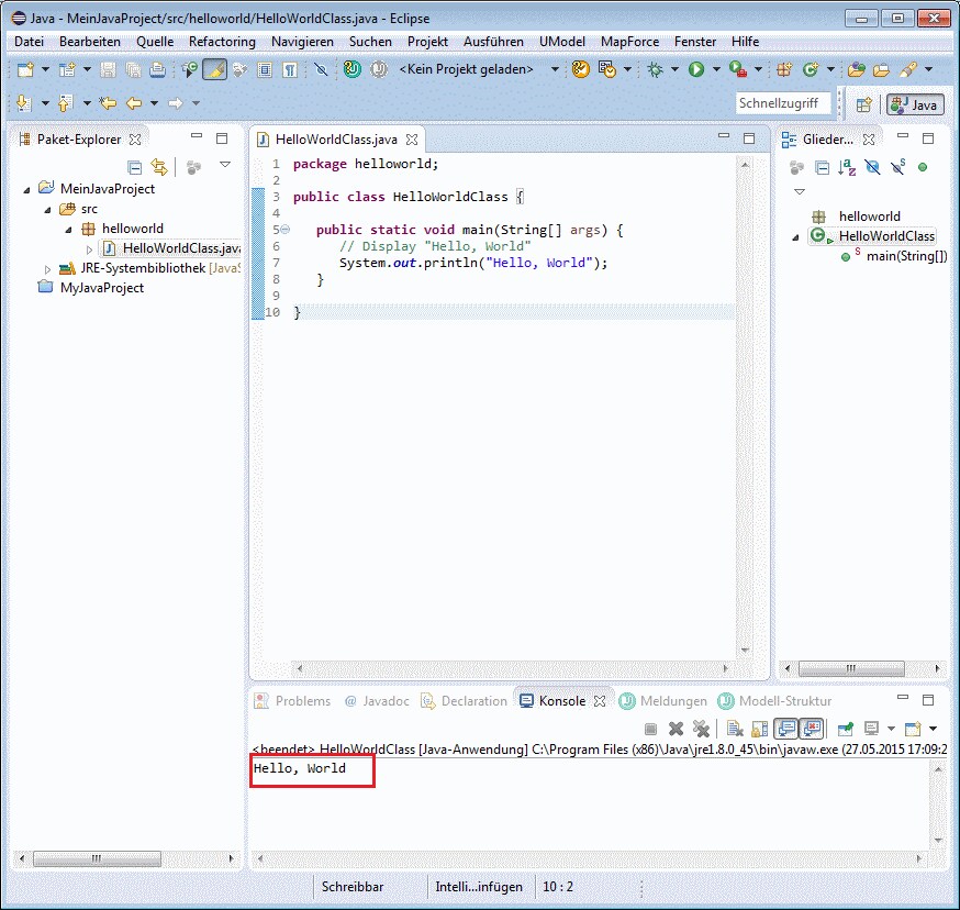 10.Führen Sie die Applikation aus. In der Konsolenansicht wird der Text "Hello World" angezeigt (siehe Abbildung unten).