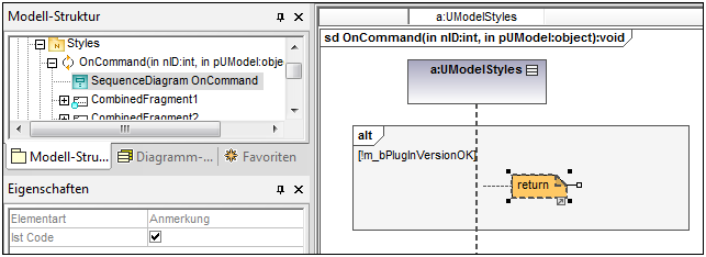 Bei Programmanweisungen, für die es keine entsprechenden Sequenzdiagrammelemente gibt, wie z.B. "i = i+1" werden in UModel "Code- Anmerkungen" verwendet, um Code zu Diagrammen hinzuzufügen. Diese Anweisungen müssen anschließend mit der Lebenslinie verknüpft werden.