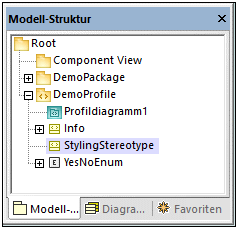 auf das "DemoPackage" angewendet wurde. Dadurch steht das Stereotyp für das Paket zur Verfügung, siehe auch Erstellen und Anwenden von benutzerdefinierten Profilen.