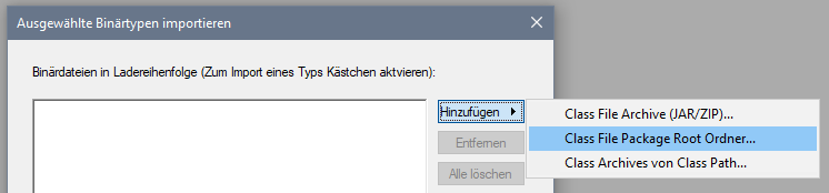 9.Wir importieren in diesem Beispiel Java .class-Dateien aus einer Paket-Root. Wählen Sie die Option Hinzufügen | Class File Package Root Ordner und navigieren Sie zum Verzeichnis C:\UModelDemo\bin. Falls dieses Verzeichnis fehlt, muss zuerst das Projekt kompiliert werden, wie im ersten Teil dieses Tutorials beschrieben.