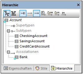 Im Fenster "Hierarchie" werden alle Beziehungen des aktuell ausgewählten Modellierungselements in zwei verschiedenen Ansichten angezeigt. Das Modellierungselement kann in einem Diagramm, im Fenster "Modell-Struktur" oder im Fenster "Favoriten" ausgewählt werden.