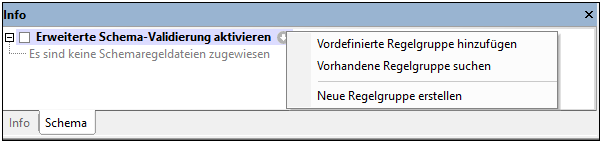 Einem aktiven XML-Schema  (.xsd-Datei) können über das Register "Schema" des Fensters "Info" eine oder mehrere Schemaregelgruppendateien (.xml-Dateien) zugewiesen werden. (Abbildung unten).