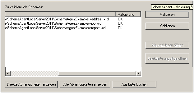 XMLSpy gestattet Ihnen in Verbindung mit SchemaAgent nicht nur das aktive Schema zu validieren, sondern auch Schemas, die mit dem aktiven Schema in Zusammenhang stehen. Wir bezeichnen dies als SchemaAgent-Validierung. SchemaAgent unterscheidet bei der erweiterten Validierung  zwischen: (i) direkt abhängigen Schemas (direkt referenzierten und direkt referenzierenden Schemas) und (ii) allen abhängigen Schemas (zusätzlich zu den direkten Abhängigkeiten gehören dazu indirekte Abhängigkeiten, d.h. die Gruppe von Schemas, die über ein Zwischenschema mit einem anderen Schema in Zusammenhang stehen.