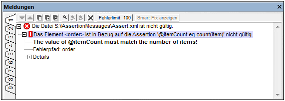 Wenn eine XML-Datei validiert wird und die Assertion bei der Überprüfung als nicht zutreffend ausgewertet wird, wird die für die Assertion definierte Meldung zusammen mit einer Fehlermeldung angezeigt (siehe Abbildung unten).