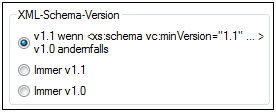 Durch Auswahl der gewünschten Version im Dialogfeld "Optionen", Einstellung XML-Schema-Version (Abbildung oben) können Sie jederzeit zwischen den beiden applikationsweiten Modi (Version 1.0 und Version 1.1) wechseln.