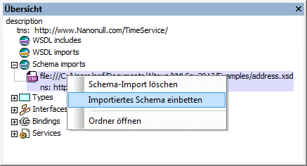 Außerdem können Sie in der Eingabehilfe "Übersicht" importierte und inkludierte XML-Schemas und WSDL-Dateien verwalten.