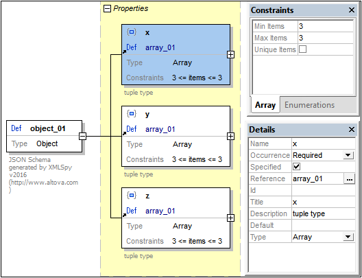 Alle drei Arrays im Codefragment oben haben dieselbe Definition. Jedes enthält drei geordnete Elemente in der folgenden Reihenfolge: (i) ein Zahlelement, ein (ii) Zahlelement, (iii) ein String-Element. In der Abbildung unten sehen Sie dieses Objekt als Schemabeschreibung. Da die Definition für alle drei Arrays dieselbe ist, wurde sie in einem globalen Array namens array_01 erstellt. Jedes der drei Arrays (x, y und z) referenziert das globale Array array_01.