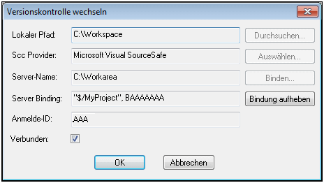Der freigegebene Ordner wird im Namen des Dialogfelds "Share to [Ordner]" angegeben. In der Abbildung oben ist es der lokale Ordner (da sich das Zeichen \$ in dem Ordner im Repository, an den der lokale Ordner gebunden ist, befindet). Sie können den freigegebenen Ordner im Dialogfeld "Versionskontrolle wechseln" (Abbildung unten, Versionskontrolle wechseln) sehen und den Ordner durch Ändern des lokalen Pfads und Binding einstellen.