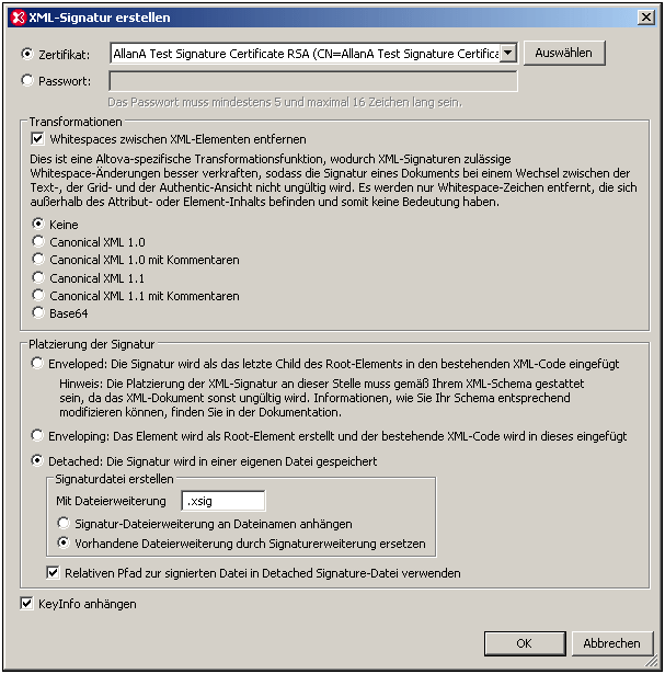 Die Option KeyInfo anhängen steht zur Verfügung, wenn die Signatur auf einem Zertifikat basiert. Wenn die Signatur auf einem Passwort basiert, steht sie nicht zur Verfügung.