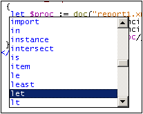 XQuery-Schlüsselwörter sind in Query-Ausdrücken verwendete Anweisungen und werden blau angezeigt. Wenn Sie den Cursor in oder unmittelbar vor oder hinter ein Schlüsselwort platzieren, wird das Schlüsselwort ausgewählt. Wenn Sie nun Strg+Leertaste drücken, wird in einem Popup-Menü eine komplette Liste aller Schlüsselwörter angezeigt. Sie können durch die Liste scrollen und auf ein Schlüsselwort doppelklicken, um das ausgewählte Schlüsselwort zu ersetzen.