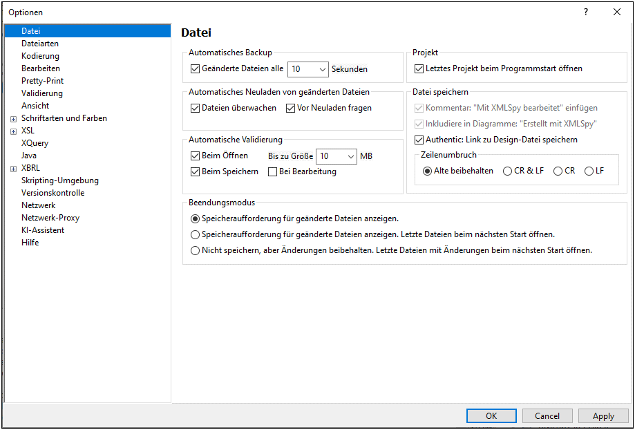 Das automatische Backup (von gerade in Bearbeitung befindlichen Dateien) kann aktiviert und deaktiviert werden. Bei Bearbeitung validieren führt während der Eingabe eine Wohlgeformtheits- und Validierungsüberprüfung durch. Falls Sie das stört, können Sie die Funktion deaktivieren und die Wohlgeformtheits- und Validierungsüberprüfung jederzeit manuell durchführen.