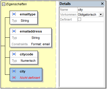 In der Design-Ansicht wird die nicht definierte Eigenschaft rot markiert, da sie im Schema als obligatorisch definiert, aber nicht vorhanden ist. Das JSON-Schema selbst ist zwar gültig, doch ist ein Instanzdokument, das anhand des Schemas validiert wird, nicht gültig. Dies hat folgenden Grund: (i) Wenn die Eigenschaft city nicht vorhanden ist, ist das Dokument ungültig, weil die Eigenschaft city obligatorisch ist. (ii) Wenn die Eigenschaft city vorhanden ist, ist das Dokument ungültig, weil die Eigenschaft city nicht definiert ist und kein Eigenschaftsplatzhalter vorhanden ist, aufgrund dessen die Eigenschaft vorhanden sein darf (siehe Implizites Definieren einer Eigenschaft weiter unten).