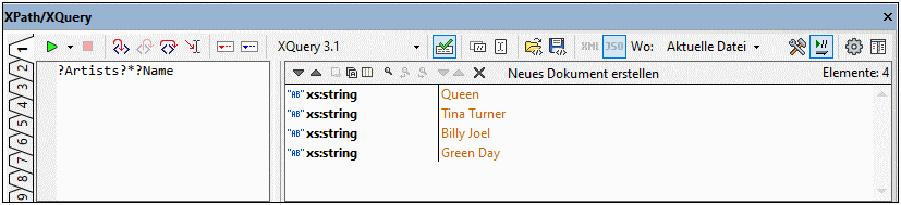 Ein aktives JSON-Dokument kann mit Hilfe von XPath/XQuery 3.1-Ausdrücken über das XPath/XQuery-Ausgabefenster abgefragt werden.