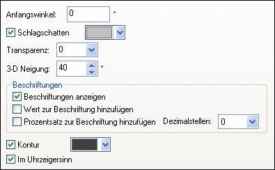 In 3-D Kreisdiagrammen können Sie einen Schlagschatten zeichnen und seine Farbe definieren sowie Transparenz zum Diagramm hinzufügen und die 3-D Neigung definieren. In 2-D Diagrammen fügt die Option Hervorhebungen eine zusätzliche Struktur zum Diagramm hinzu.