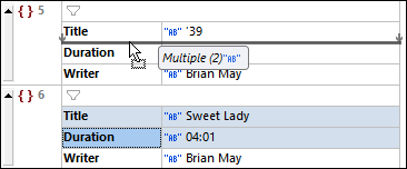 Wenn das Ziel die Node-Struktur und nicht eine Zelle ist, wird der hinzugefügte Node zusammen mit (i) den Spalten, die hinzugefügt werden (innerhalb von eckigen Klammern) und (ii) der Anzahl der Instanzen des neuen Eintrags angezeigt. So wird z.B. in der Abbildung unten ein Array bestehend aus zwei Objekten, mit jeweils einem Title, Duration und Writer Schlüssel-Wert-Paar hinzugefügt.