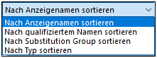Nach Anzeigenamen sortieren: Die Elemente werden nach Ihrem Namen sortiert in alphabetischer Reihenfolge angezeigt. Die Namen enthalten auch das Präfix, d.h. abc:yname wird vor bcd:xname angezeigt.