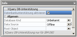 Die DB-Unterstützung für ein XQuery-Dokument wird durch Aktivierung des Kontrollkästchens "Datenbankunterstützung aktivieren" im Fenster "Info" (Abbildung unten) aktiviert. Beachten Sie: Die Unterstützung von DB muss für jedes XQuery-Dokument separat aktiviert werden. Jedes Mal muss ein XQuery-Dokument neu geöffnet werden.