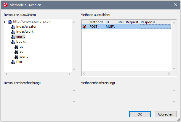 3.Wählen Sie im linken Bereich (siehe Abbildung oben) den entsprechenden WSDL-Endpoint oder die entsprechende WADL-Ressource (diejenige, die den gewünschten Request enthält) aus.
