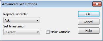 Hier können Sie Optionen zum (i) Ersetzen ausgecheckter beschreibbarer Dateien (ii) zum Zeitstempel und (iii) ob die Eigenschaft "Schreibgeschützt" der abgerufenen Datei geändert werden soll, damit die Datei beschreibbar wird, einstellen.