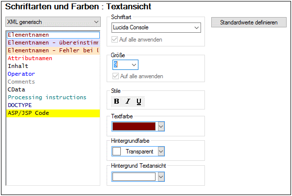 Im Abschnitt Schriftarten und Farben finden Sie Optionen zum Anpassen der Darstellung von Texteinträgen in den verschiedenen Ansichten von XMLSpy.